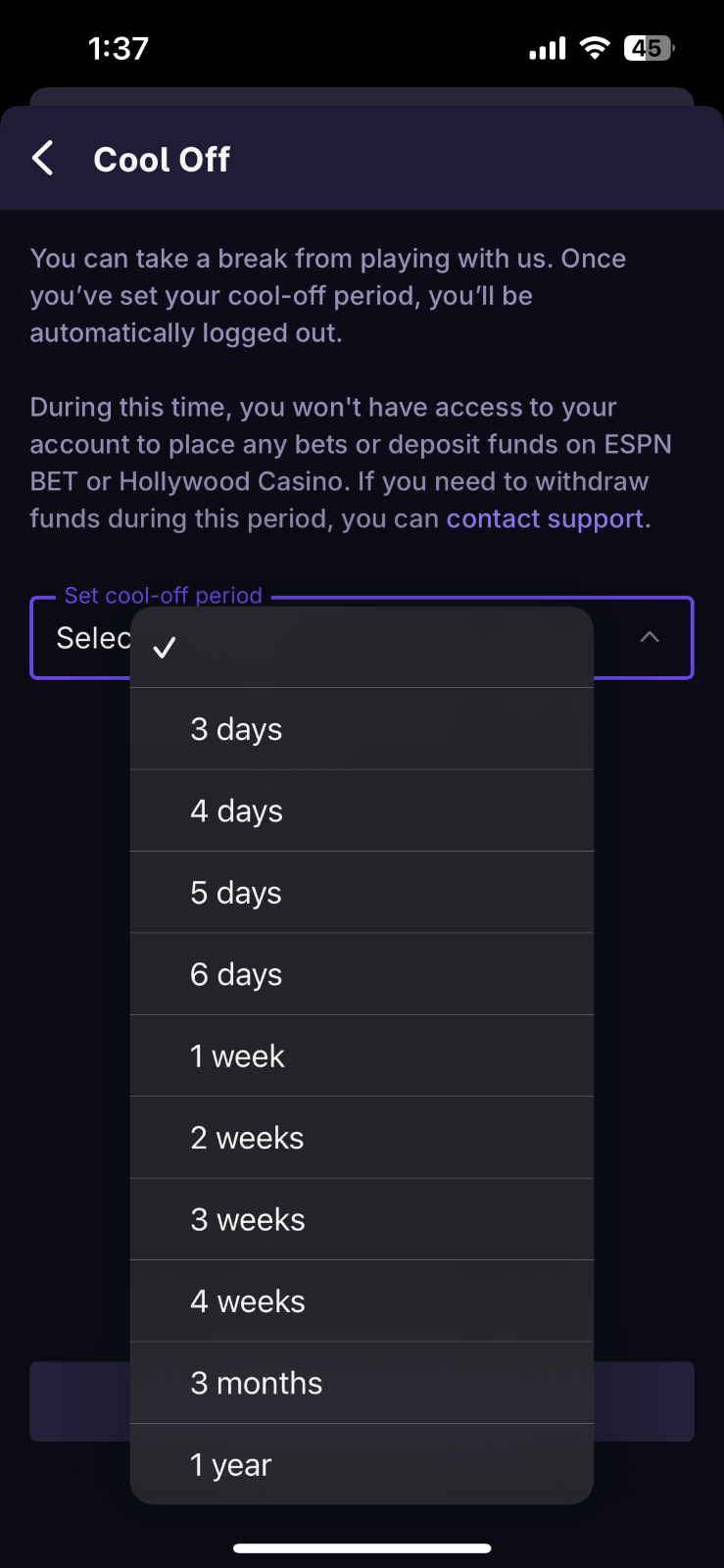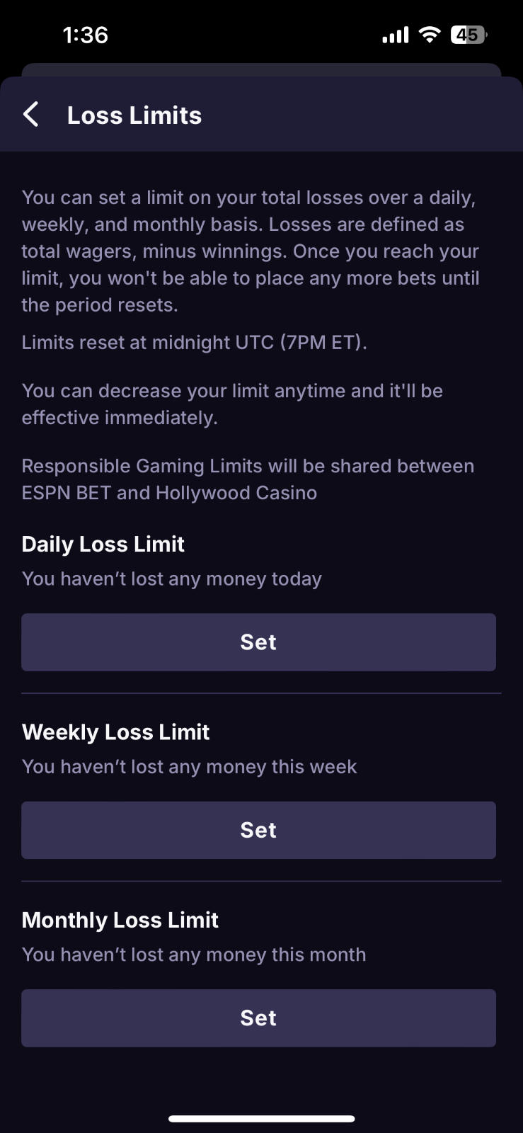 Daily Time Limit - Set a limit on the amount of time you spend on theScore Bet and Hollywood Casino per day. Once you hit your self-imposed daily time limit, you will be logged out and will no longer have access to theScore Bet and Hollywood Casino until it resets the following day 12 AM ET.